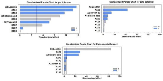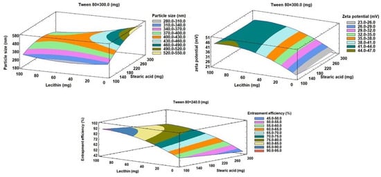 On the other hand, it was found that the zeta potential was significantly adversely affected by the SA quantity (X1) (Figure 1, Figure 2 and Figure 3). This can be seen from the difference in zeta potential between F1 and F15, where increasing the amount of SA from 100 mg to 300 mg resulted in a drop in zeta potential from −41.2 mV to −38.8 mV at the same level of X2 and X3. The potential was raised for F15 and F7 from −38.8 mV to −44.6 mV, respectively, by reducing the amount of Tween 80 from 300 mg to 100 mg at the same level of SA and lecithin (Table 2). The same effect was seen for X2. This could be explained by the nonionic nature of Tween 80, which, when adsorbs on the surface of the NLC particles, reduces the net charge on the particle surface [].