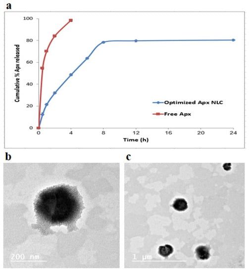 The in vitro release of Apx from the NLC formula compared to free Apx was tested for 24 h in simulated intestinal fluid (pH 6.8) and is demonstrated in Figure 4a. The graph shows that the release of Apx from the NLC formula was biphasic, with the first phase being a quick release and the second one being a sustained release. The slower later release came from Apx was integrated into the NLC core and released in a sustained pattern through the matrix erosion or degradation. In contrast, the faster initial release came from Apx, rapidly diffusing from the surface [,]. Compared to the free Apx, it was clear that the optimized formula showed a slower release. The free Apx released almost 100% after four hours, while a much smaller amount of the drug was released from the formula within the same period.