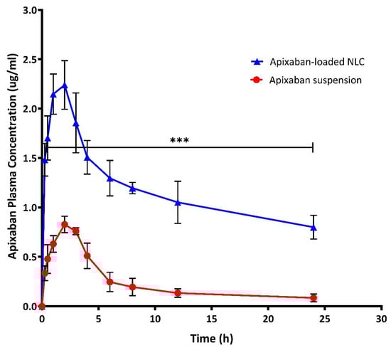 Apixaban (Apx), an oral anticoagulant drug, is a direct factor Xa inhibitor for the prophylaxis against venous thromboembolism. Apx has limited oral bioavailability and poor water solubility. The goal of this study was to improve the formulation of an Apx-loaded nanostructured lipid carrier (NLC) to increase its bioavailability and effectiveness. As solid lipid, liquid lipid, hydrophilic, and lipophilic stabilizers, stearic acid, oleic acid, Tween 80, and lecithin were used, respectively. Utilizing Box–Behnken design, the effects of three factors on NLC particle size (Y1), zeta potential (Y2), and entrapment efficiency percent (Y3) were examined and optimized. The optimized formula was prepared, characterized, morphologically studied, and pharmacokinetically and pharmacodynamically assessed. The observed responses of the optimized Apx formula were 315.2 nm, −43.4 mV, and 89.84% for Y1, Y2, and Y3, respectively. Electron microscopy revealed the homogenous spherical shape of the NLC particles. The in vivo pharmacokinetic study conducted in male Wistar rats displayed an increase in AUC and Cmax by 8 and 2.67 folds, respectively, compared to oral Apx suspension. Moreover, the half-life was increased by 1.94 folds, and clearance was diminished by about 8 folds, which makes the NLC formula a promising sustained release system. Interestingly, the pharmacodynamic results displayed the superior effect of the optimized formula over the drug suspension with prolongation in the cuticle bleeding time. Moreover, both prothrombin time and activated partial thromboplastin time are significantly increased. So, incorporating Apx in an NLC formula significantly enhanced its oral bioavailability and pharmacodynamic activity.