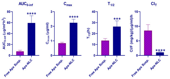 Animal studies were carried out in compliance with the protocol (#202104PHDA1) approved by the research ethics committee of the Faculty of Pharmacy, Suez Canal University. The studies were performed on male Wistar rats with a mean body weight of 200 ± 20 g. During the study, the animals were housed in plastic mesh cages with water and regular laboratory feed under normal lighting (12 h light/dark cycles), humidity, and temperature conditions. All rats were denied food and drink overnight the day before the experiment. The rats were randomized into three groups; Group A (n = 6) was administered normal saline (control group), Group B (n = 12) was given a single oral dose of (60 mg/kg) of a free drug suspension and Group C (n = 12) which was administered the optimized Apx-loaded NLC of the same dose []. Free Apx suspension was prepared in deionized water using glycerin and 0.2% gum tragacanth []. Afterward, the groups were further subdivided to perform pharmacokinetic and pharmacodynamic studies. Statistical analysis of results was done using an unpaired Student t-test to compare the results of groups B and C to each other and to control results (group A). Data were presented as the mean ± SD with a p-value of less than 0.05 was considered significant.