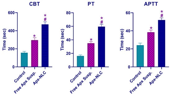 To determine the impact of the Apx-loaded NLC on the coagulation process in comparison to the free drug suspension and control group, clotting time parameters, including PT and APTT, were assessed [,]. A fraction of the rats (n = 3 for each study group) had their blood samples taken two hours after delivery, and they were then treated, as mentioned before under the pharmacokinetics section, to produce plasma, which was used right away to evaluate PT and APTT []. Baxter Healthcare Corporation (Deerfield, IL, USA) provided the Dade Thromboplastin-C reagent, which was used to assess PT utilizing a mechanical clot detection technique with an ISI of 2.0. APTT was again determined using Dade Actin FSL reagent, Siemens Healthineers (Erlangen, Germany), applying mechanical clot detection technique.