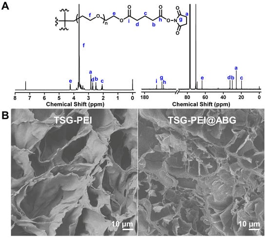 (A) 1H NMR and 13C NMR spectra of the tetra-PEG-SG polymer in CDCl3. (B) SEM images of TSG-PEI and TSG-PEI@ABG hydrogels.