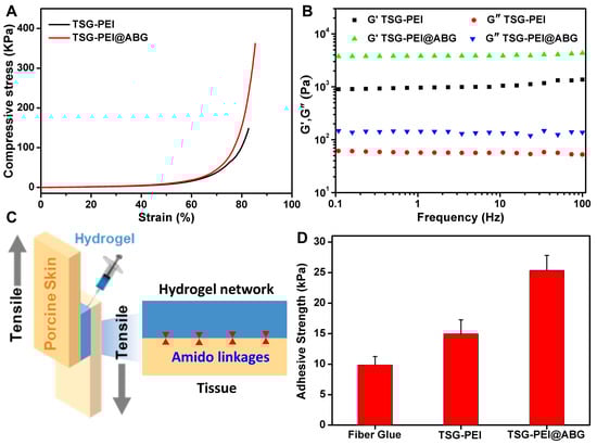 (A) Compressive and (B) rheological behaviors of TSG-PEI and TSG-PEI@ABG hydrogels. (C) Schematic illustration of the tissue adhesion test. (D) The tissue adhesion strengths of commercial fibrin glue, TSG-PEI, and TSG-PEI@ABG hydrogels.