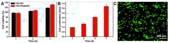 In view of its favorable structures, pores, mechanics, and adhesion force of the TSG-PEI@ABG hydrogel, it is necessary to assess the cell biocompatibility for this engineered scaffold. Therefore, we co-cultured the BMSCs with the hydrogel extract to evaluate the in vitro cytocompatibility by CCK-8 and live/dead staining assays. Quantitatively, the TSG-PEI hydrogels had capacities on maintaining a high cell survival level over the times with or without being laden with ABG. The cell viability ratio at day 3 was obviously higher than that of day 1, indicating the low cytotoxicity and high cell proliferation behaviors (Figure 4A). In addition, the ABG intervention not only did not impair the material cytotoxicity but also promoted the cell growth, which indicated the uniform dispersion within the networks instead of the large aggregates and implied the important roles of ABG substrate on promoting cell proliferation after prolonged incubation. As expected, the cells within the TSG-PEI@ABG hydrogel continued to increase after 7 days of culture in vitro (Figure 4B), further revealing the outstanding cell activity and proliferation behavior of the ABG-doped hybrid scaffold. Live/dead assay in Figure 4C showed almost all the luminous green lights and clearly demonstrated the high cell viability after culture with this hydrogel scaffold for 24 h. Therefore, we believe that the porous structures and good mechanical properties of this biocompatible TSG-PEI@ABG scaffold are able to enhance cell activity, growth, proliferation, and differentiation.