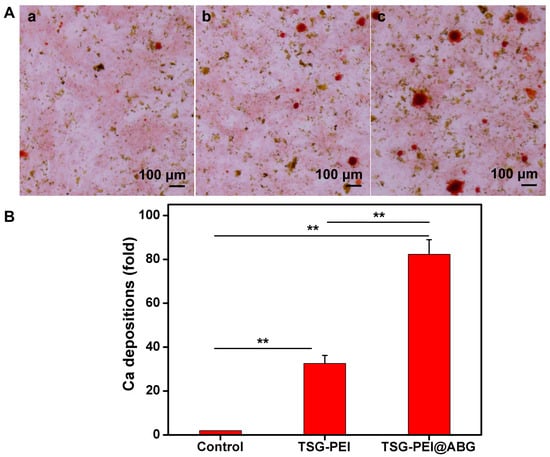 (A) Osteogenic differentiation detected based on Alizarin red. (a) The control (untreated cells), (b) TSG-PEI hydrogel, (c) TSG-PEI@ABG hydrogel. (B) In vitro osteogenic differentiation via the semi-quantification of calcification depositions. Statistically significant differences in comparison with control untreated cells, TSG-PEI hydrogel, and TSG-PEI@ABG hydrogel (** p < 0.01).