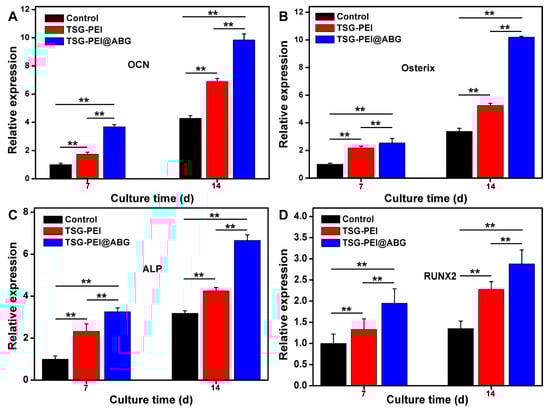 qRT-PCR analysis of the mRNA levels of relative gene expressions of (A) OCN, (B) Osterix, (C) ALP, and (D) Runx 2 on days 7 and 14 of culture. Statistically significant differences of the control group, TSG-PEI group, and TSG-PEI@ABG group (** p < 0.01).