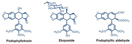 - Gordaliza, M.; García, P.A.; Miguel del Corral, J.M.; Castro, M.A.; Gómez-Zurita, M.A. Podophyllotoxin: Distribution, sources, applications and new cytotoxic derivatives. Toxicon 2004, 44, 441–459. [Google Scholar] [CrossRef]