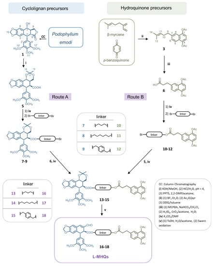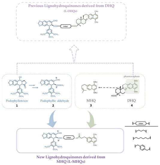 In previous work [], we prepared hybrids, generically named lignohydroquinones (L-HQs), by linking cyclolignans (L) and a diterpenylnaphthohydroquinone (DHQ, Figure 2) through aliphatic and aromatic linkers. The DHQ was obtained by us from the natural diterpenoid myrceocommunic acid [] and the cyclolignan scaffold was obtained by transforming podophyllotoxin (1) into the podophyllic aldehyde (2) (Figure 2) [].