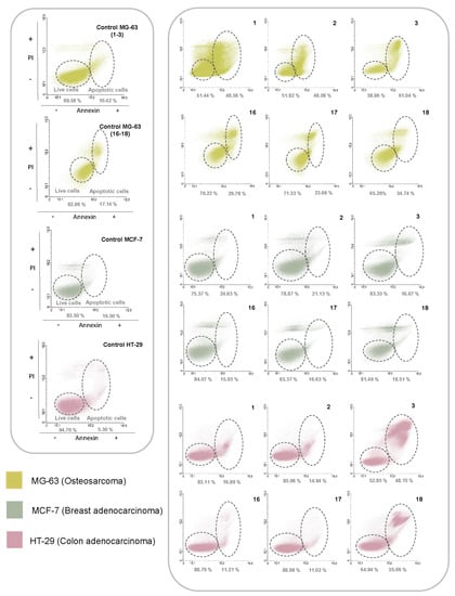 Apoptosis assays results observed by flow cytometry for the precursors 1–3 and the hybrids L-MHQs 16–18 in MG-63 (osteosarcoma), MCF-7 (breast cancer), HT-29 (colon adenocarcinoma) cells at 24 h of incubation at 1 µM. Control with vehicle (DMSO, <0.001%).