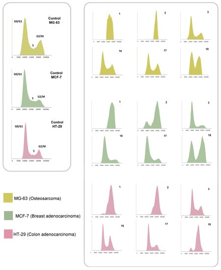 Cell lines and culture conditions: The human colorectal adenocarcinoma (HT29, ATCC HTB-38), the human breast cancer (MCF7, ATCC HTB-22), and the human osteosarcoma (MG-63, ATCC CRL-1427) cell lines were grown in an adherent monolayer culture in Dulbecco’s Minimum Essential Medium (DMEM) for HT29 and MCF7 cells and RPMI medium for MG-63, both supplemented with 10% heat-inactivated fetal bovine serum (FBS), 1% L-glutamine, and 1% penicillin/streptomycin in a humidified atmosphere (5% CO2, 37 °C). All media and supplements were purchased from Sigma (St. Louis, MO, USA).