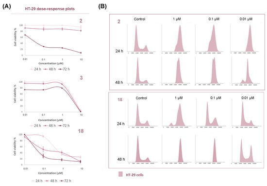 (A) Dose–response plots of the precursors 2 and 3 and the hybrid 18 at different times of incubation (24, 48, and 72 h) and concentrations (0.01–10 µM) in HT-29 cells. (B) Flow cytometry plots of the effect of 2 and 18 at different times of incubation (24 and 48 h) and concentrations (1–0.01 µM) in HT-29 cells.