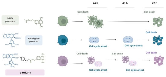 In this case, L-MHQ 18 induced cell cycle arrest at all dilutions evaluated, including the lowest dilution, as occurred with podophyllic aldehyde, 2. These results, along with the previously observed apoptosis patterns (Figure 3) and cell cycle trends (Figure 4), suggested the involvement of dual mechanisms of cell death progression in the final cytotoxicity of the hybrid 18 (Figure 6): first, showing cell death at an early time of incubation (as the MHQ precursor 3) and reaching the nM level at the final time of incubation (as the cyclolignan precursor 2). This progression is illustrated in Figure 6.