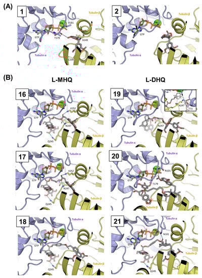 Docking complexes in the colchicine binding site of tubulin for: (A) precursors 1 and 2 and (B) L-MHQs 16–18 and L-DHQs 19–21. GTP, the inhibitors, and those residues that interact with the inhibitors via hydrogen bonds are shown atomistically. The two protomers α- and β-tubulin are shown in purple and yellow, respectively.