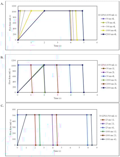 Trapezoidal waveforms for various inhalation profiles at peak inspiratory flow rates of 60 LPM (1030 mL/s) and 30 LPM (510 mL/s) associated with data from Table S1. (A) The profiles show changes in acceleration rates: 50 ms (blue), 170 ms (orange), 500 ms (gray), 1000 ms (yellow), and 2000 ms (dark blue) ramp times to reach the 60 LPM peak flow rate corresponding to 20, 5.88, 2, 1, and 0.5 L/s2 acceleration rates, respectively, for a 4 L inspired volume. (B) The profiles show changes in inspired volumes at the 50 ms ramp time corresponding to a 20 L/s2 acceleration rate for the 1 L (red), 2 L (purple), and 4 L (blue) volume, and 2000 ms ramp time corresponding to a 0.5 L/s2 acceleration rate at the 1 L (green), 2 L (dark red), and 4 L (dark blue) volume to reach the 60 LPM peak flow rate. (C) The profiles show changes in inspired volume at a 25 ms ramp time corresponding to a 20 L/s2 acceleration rate at the 1 L (red), 2 L (purple), and 4 L (blue) volume and 1000 ms ramp time corresponding to a 0.5 L/s2 acceleration rate at the 1 L (green), 2 L (dark red), and 4 L (dark blue) volume to reach the 30 LPM peak flow rate.