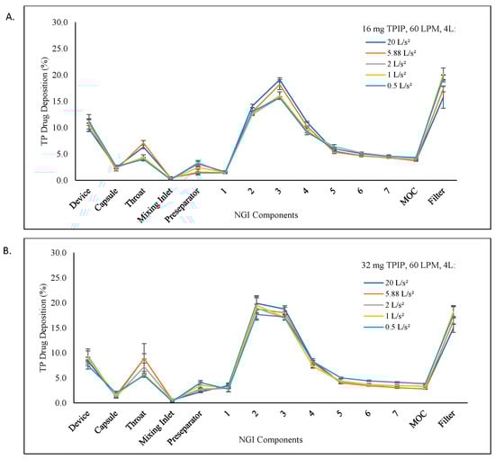 In general, effective drug aerosol performance for dry powder formulations is dependent on the combination of the device characteristics and formulation properties. Passive DPIs require an inspiratory flow rate through the device with adequate energy to deagglomerate and disperse the powder to reach the lungs, and this minimum force will vary depending upon the specific characteristics of that powder in that device. Regulatory compendia assume an inspiratory effort equivalent to a 4 kPa pressure drop [,], which may not be achievable by patients with respiratory muscle weakness or mechanical disadvantage. The high-resistance (HR) RS01 device was selected over other RS01 devices with different resistances based on the generation of a superior FPD with low variability along with dose proportionality from three different capsule doses (8, 16, and 32 mg TPIP) []. Subsequent in vitro studies were also performed to evaluate the effect of variations in inspiratory pressure on device performance []. The results of those studies demonstrated consistent aerosol performance independent of the TPIP capsule dose for inspiratory device flow rates both below (40 LPM flow rate corresponding to a 1.4 kPa pressure drop) and above (80 LPM corresponding to a 5.4 kPa pressure drop) the compendial 4 kPa pressure drop equivalent to a 60 LPM inspiratory flow rate []. Thus, these in vitro efforts were designed to extend those findings to model TPIP performance using more realistic inhalation profiles at both the compendial and non-compendial settings, and for subjects with reduced lung capacity down to a volume of 1 L to better simulate clinical use of the device by patients with impaired pulmonary function due to underlying disease.
