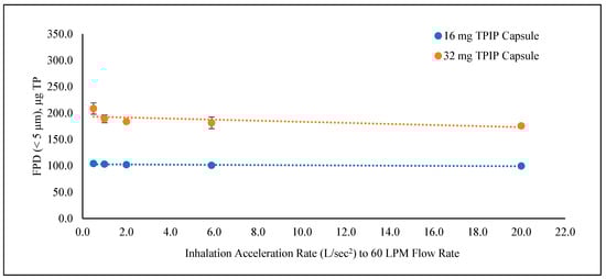 TP fine particle dose (FPD) as a function of inhalation acceleration rate to reach the 60 LPM peak inspiratory flow rate for a 4 L inhalation volume. The dotted lines show the change in FPD values for the 16 mg TPIP (blue) and 32 mg TPIP (orange) capsules as the acceleration rate increased from 0.5 L/s2 (2000 ms ramp) to 20 L/s2 (50 ms ramp).