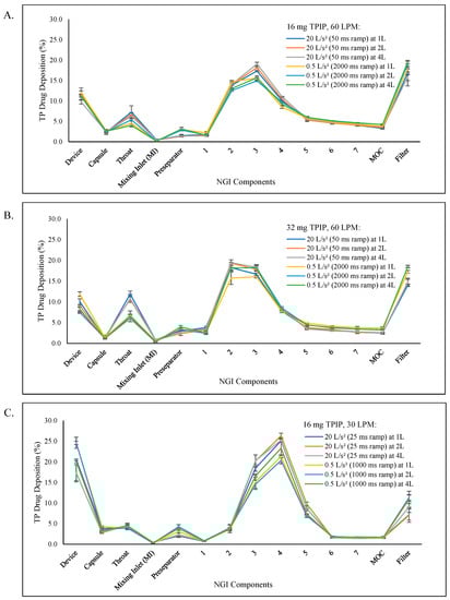 TP aerosol deposition profiles in the NGI as a function of inhaled volume. The profiles show the percentage of TP recovered (mean ± SD) from each component of the NGI for each inhalation volume with 20 and 0.5 L/s2 acceleration rates to reach the 60 and 30 LPM peak inspiratory flow rates. (A) 16 mg TPIP capsules at a 50 ms ramp time for the 1 L (blue), 2 L (orange), and 4 L (gray) volumes, and 2000 ms ramp time for the 1 L (yellow), 2 L (light blue), and 4 L (green) volumes to reach the 60 LPM peak flow rate. (B) 32 mg TPIP capsules at a 50 ms ramp time for the 1 L (blue), 2 L (orange), and 4 L (gray) volumes, and 2000 ms ramp time for the 1 L (yellow), 2 L (light blue), and 4 L (green) volumes to reach the 60 LPM peak flow rate. (C) 16 mg TPIP capsules at a 25 ms ramp time for the 1 L (blue), 2 L (orange), and 4 L (gray) volumes, and 1000 ms ramp time for the 1 L (yellow), 2 L (light blue), and 4 L (green) volumes to reach the 30 LPM peak flow rate.