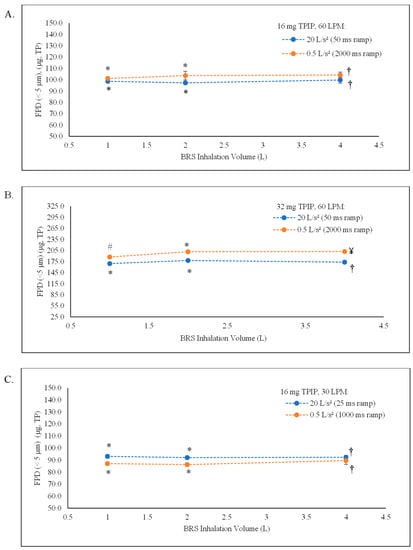 TP fine particle dose (FPD) trend lines as a function of the total inhalation volume. The dotted lines show the change in FPD values as inhalation volume increases for the 20 L/s2 (blue) and 0.5 L/s2 (orange) acceleration rates at the 30 and 60 LPM peak inspiratory flow rates. (A) 16 mg TPIP capsules at the 60 LPM flow rate. (B) 32 mg TPIP capsules at the 60 LPM flow rate. (C) 16 mg TPIP capsules at the 30 LPM flow rate. * p-value > 0.05 for the 1 and 2 L inhalation volumes compared to the 4 L inhalation volume, # p-value < 0.05 for the 1 L inhalation volume compared to the 4 L inhalation volume, † p-value > 0.05 for the overall comparison of inhalation volumes for the 20 L/s2 acceleration rate (16 mg and 32 mg) and 0.5 L/s2 acceleration rate (16 mg), and ¥ p-value < 0.05 overall comparison of inhalation volume for the 0.5 L/s2 acceleration rate (32 mg) associated with data from Table 3 and Table 4.