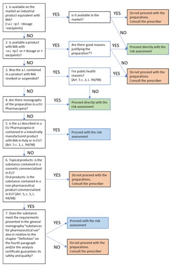 Decision tree for drug compounding. MA = Marketing authorization; EU = European Union; a.i. = active ingredient; p.f. = pharmaceutical form; Art. 5, c. 1, L. 94/98 and Art. 5 c. 2, L. 94/98 = Italian Legislative Decree 94/1998, Article 5, paragraph 1 and Italian Legislative Decree 94/1998, Article 5, paragraph 2, respectively. * Intolerance, allergy, idiosyncrasy to an excipient. In this case: use capsule shell of plant origin; improve the taste; make it easily washable by adding surfactants of semi-solid preparations for cutaneous use; do not use fragrances or dyes; change the pharmaceutical form from a capsule to a gel to be dissolved (pediatric patients, effects of a stroke or Alzheimer’s disease); set up a preparation for a substance with a low therapeutic index.