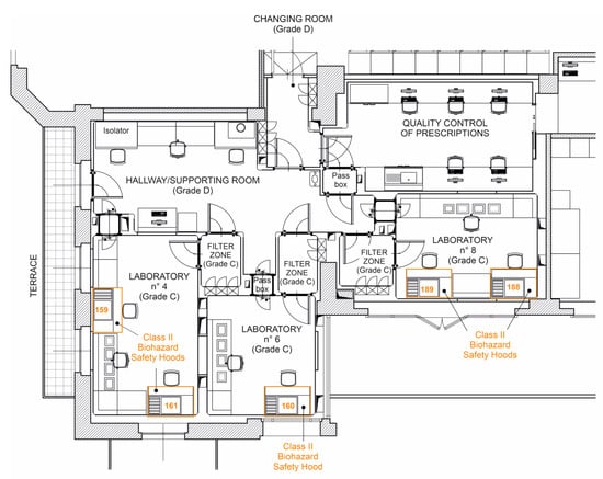 Planimetry of IOV-IRCCS’ UFA. Drug compounding is performed in a Grade A cleanroom, according to ISO 14644-1 standards. Therefore, the UFA consists of three Grade C cleanrooms (laboratories number 4, 5 and 6), which have unidirectional vertical laminar airflow hoods with HEPA filters, bio-safe BIOHAZARD, Class II. Orange numbers refer to an internal numbering of hoods. Filter zones permit access to the Grade D backroom.