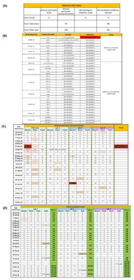 Microbiological controls performed at IOV-IRCCS’ UFA in 2022. The numbers refer to the colony-forming unit (CFU) calculated. (A) Reference limit values according to Annex 1: “Manufacture of sterile products” (Good Manufacturing Practice, GMP—European Commission) []. (B) Operators’ gloves media-fill tests. (C) Surface microbial contamination assessment performed using swab in the central working area of the hood during the operating phases. (D) Air monitoring in preparation laboratories.