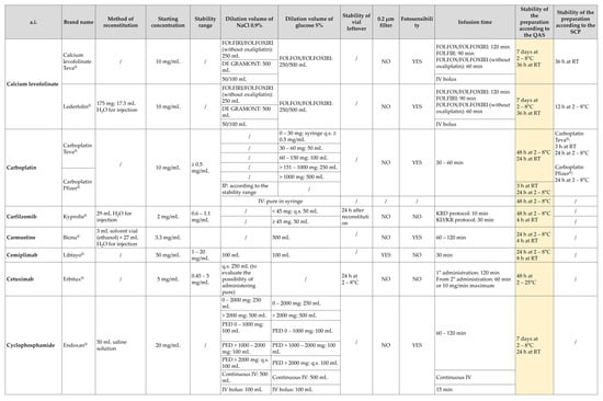 Once validated a prolonged microbiological stability, it is important to also determine the physiochemical and biological stability of the drug, in both the original opened vial and its derived preparations, considering all vehicles, excipients and the containers or packages employed. A systematic and critical review of the literature was performed. In the final choice of the stability to be applied to each preparation, based on the guarantees assured from the QAS applied, the 7 day threshold was never exceeded (with the only exception for Blincyto) and, where the literature presented contradictions, the conservation limits have always been largely restrictive and precautionary. For almost all molecules, a stability at both room temperature and 2–8 °C was defined, and when studies proved low stability of a.i. at low temperatures, a stability of 24 h at 2–8 °C was considered. On this ground, a summary table of a.i. and related preparations in use at the IOV-IRCCS (Figure 7) was drafted, which reports: description of the a.i., brand name, method of reconstitution (volume and solvent to be used), concentration of the original solution, volume of dilution using sodium chloride 0.9% or glucose 5% solutions, stability of the opened vial leftover, use of 0.2–0.22 µm filter, photosensitivity of the drug, time range of infusion of the compounded drug, stability of the diluted drug according to selected literature and to the SPC, and eventual notes for compounding. Notably, with this table, an extension of the stability, with respect to the SPCs, of expensive molecules such as trastuzumab, bevacizumab, atezolizumab and rituximab was assigned. From an organizational point of view, in order to avoid excessive variability of the dilution volumes during the preparation, a simplification of dilution ranges was performed. In accordance with the concentration ranges of stability, working at “increased volume”, which means inserting the required volume of the drug into the bags without removing an equal volume of diluent, turned out to be compatible for the majority of the drugs, reducing the number of operations required for compounding, and consequently the overall risk.