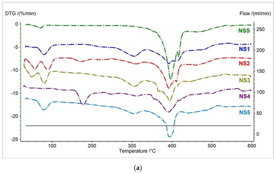 The DTG and D2TG curves for all pharmaceutical preparations containing naproxen in salt form correlate with the NSS (Figure 6a and Figures S4–S8, Table 6). This result confirms that the tested drugs contain naproxen sodium salt, as indicated by the recorded characteristic peaks on the DTG curves—especially peaks related to the decomposition of naproxen sodium (peaks two to four). The first stage associated with water loss was recorded for the study drugs NS1–NS5 (Figure 5, Table 6). The maximum mass loss for stage one for drugs NS1–NS3 and NS5 was shifted slightly towards higher temperatures and ranged from 80 °C (NS1) to 88.4 °C (NS2). For sample NS4, this stage was the smallest and occurred at the temperature closest to the standard (Table 6). This is likely related to the addition of excipients not present in other formulations. The peaks associated with the NSS decomposition recorded for pharmaceutical preparations fully coincided with the naproxen sodium standard. For tested drugs, the maximum mass loss for the second stage occurred in the range of 388.6 °C (NS4) to 397 °C (NS1); for the third stage, in the range of 411.3 (NS2) to 423.5 (NS4); and for the last stage, in the range of 457 °C (NS5) to 466 °C (NS4).