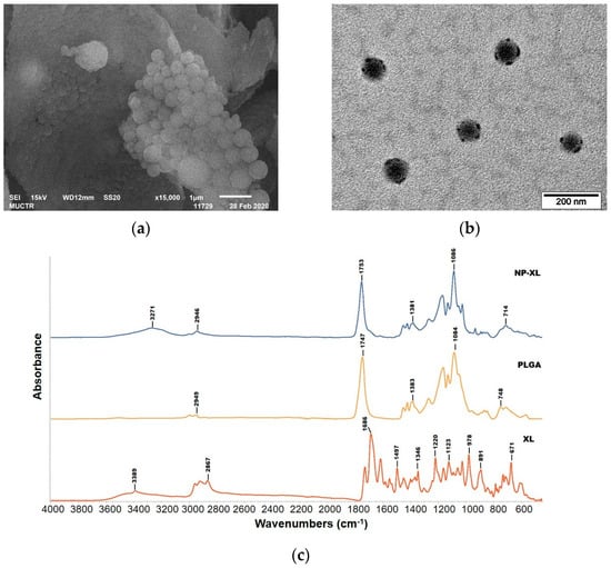 Shape and surface morphology of NP–XL were analyzed with scanning electron microscopy (SEM) and transmission electron microscopy (TEM). A suspension NP–XL in distilled water was dropped onto the surface of a formvar-coated copper grid (Gilder Grid Square 200 Mesh), followed by the evaporation of the solvent to prepare sample for TEM. Then, 10 µL of UranyLess solution (Electron Microscopy Sciences, Hatfield, PA, USA) was also dropped onto the surface of a formvar-coated copper grid and incubated for 20 s to enhance the contrast of the TEM images. The grid was then washed twice in deionized water. To prepare the sample for SEM, a drop of NP–XL water suspension (1 mg/mL) was placed on a double-sided carbon tape, respectively, and dried for 30 min. Samples were coated with a gold layer. TEM analysis was performed on a JEM-1400 microscope at 120 kV (JEOL, Tokyo, Japan). SEM analysis was performed on a JSM-6510LV microscope (JEOL, Tokyo, Japan).