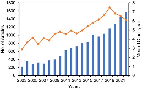 Growth of annual scientific production (lines) and mean TC per year (bar) (total citation divided by number publication divided by years of publication).