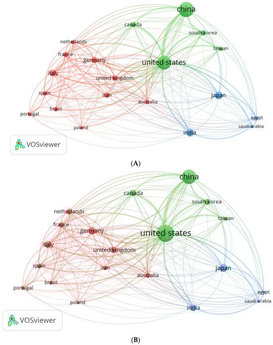 Map of international collaboration as a network visualization. (A) Based on the number of documents; (B) based on citations.