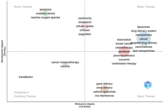 To gain further insights into the extracted keywords, Biblioshiny was utilized to generate a thematic map (Figure 4). Thematic maps are commonly employed in bibliometric studies to explore and present the diverse topics identified within a collection of published materials. The extracted keywords were classified into four overarching thematic groups: niche, motor, emerging, and basic themes. Within the niche themes, apoptosis, oxidative stress, and reactive oxygen species emerged as prominent areas of study. These topics likely represented specialized and focused research within the broader context of liposome application in cancer therapy. The thematic analysis conducted in this study offers valuable insights into the various research themes and topics prevalent in this area of research.
