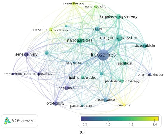 Two complementary methods were employed to gain deeper insights into the author’s keyword analysis. The first method involved creating an average publication year-based normalized overlay of keyword clusters, as illustrated in Figure 5A. The color-coded clusters in the figure represent author keywords based on their publication dates, with yellow indicating recently published keywords. This visualization provides a comprehensive overview of how different keyword clusters have evolved. The second method utilized Biblioshiny to visualize trend topics, as shown in Figure 5B. This analysis revealed that cancer immunotherapy, lipid nanoparticles, and pancreatic cancer are the most extensively researched author keyword trends in the last four years of this field. By exploring trend topics, researchers can identify the evolving interests and priorities within liposomes’ application in cancer therapy. Remarkably, both methods yielded consistent findings, reinforcing the robustness of the results. The number of citations varied widely across individual author keywords. To account for the influence of publication age on citation counts, the publication date was used to normalize the citations, ensuring a fair comparison across different periods. Figure 5C displays the normalized mean number of citations for the author keywords under consideration. Among the author keywords, curcumin, cancer immunotherapy, cancer therapy, and nanomedicine demonstrated the highest normalized citation counts, indicating their significant impact and visibility within the research literature. These data provide a comprehensive understanding of the temporal trends, topical foci, and citation impacts of author keywords in the field of liposomes’ application in cancer therapy. These insights contribute to the growing knowledge base and aid researchers in identifying key areas of interest and potential avenues for future research.