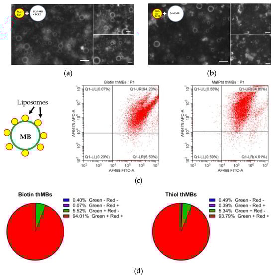 Liposomes can be bound to MBs using maleimide–thiol linkages to the same degree as biotin–avidin linkages. (a,b) Linkages using either maleimide liposomes with PDP-containing MBs or PDP liposomes with maleimide-containing MBs are feasible. The fluorescence detected around the MBs shows loading of the liposomes on the MB surface. Scale bar denotes 10 μm. (c) Biotin and maleimide MBs were generated with green fluorescent lipid in their shell and the SN38-encapsulating liposome (biotin or PtD) was generated with red fluorescent lipid in their shell. Example flow cytometry plots gated on the MB population show the fluorescence from biotin liposome-loaded MBs (left) or thiol liposome-loaded MBs (right). The pie charts show the percentage of all MBs with liposomes bound to them (green +, red +) as determined by flow cytometry (d).