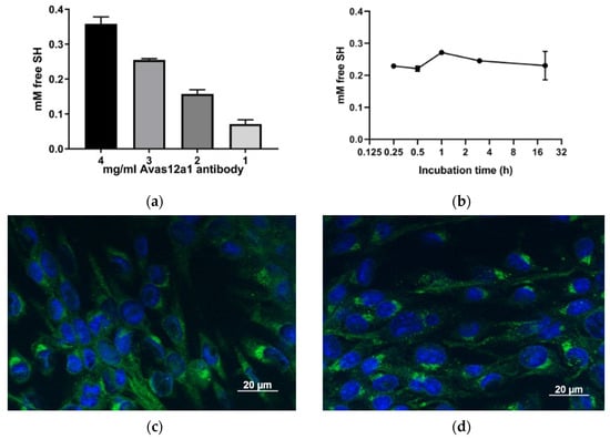 Antibodies can be thiolated using Traut’s reagent and retain their antigen recognition properties. The anti-mouse VEGFR2 antibody, Avas12a1 was thiolated using Traut’s reagent. Ellman’s assay quantified the amount of free sulfhydryl with decreasing concentrations of input antibody (a) and over incubation time with the Traut’s reagent using 3 mg/mL antibody (n = 3, mean and standard deviation are shown) (b). Mouse endothelial SVR cells were incubated with thiolated (c) or non-thiolated (d) mouse anti-VEGFR2 antibody to examine any difference in staining patterns that would indicate disruption of VEGFR2 recognition.