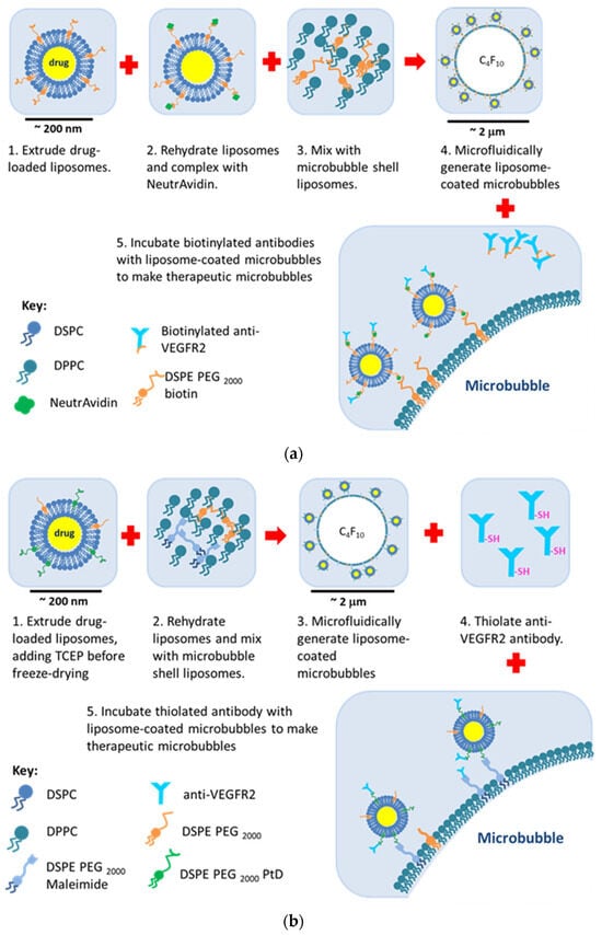 However, although these studies have shown promising results pre-clinically, to our knowledge, no study has directly compared whether there is an advantage or disadvantage of each linkage in terms of targeting, ultrasound imaging properties or drug delivery or whether they show parity. Therefore, the aim of this study was to define which liposome–MB linkage system was most suited to each of these applications.