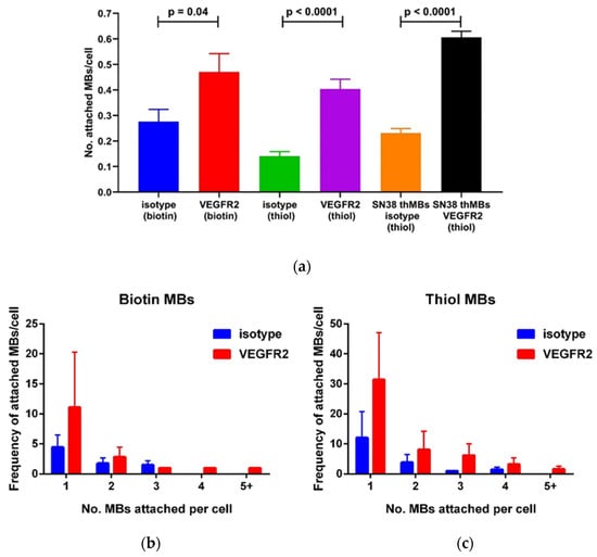 Thiolated antibodies on MBs or thMBs show good targeting specificity in vitro. (a) VEGFR2- or isotype-targeted MBs were bound to mouse SVR endothelial cells under fluid flow. Biotin–avidin linkages and maleimide–thiol linkages for both VEGFR2-targeted MBs and thMBs were compared to isotype, unpaired t-test, two-tailed). n = 3 experimental replicates; mean and standard deviation are shown. The frequency of single or multiple targeted MBs bound per cell was plotted for isotype or targeted antibodies with biotin linkages (b) or thiol linkages (c).