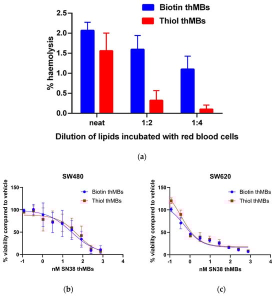 Before injection of these MB structures in vivo, it was necessary to determine whether there was any toxicity that may be associated with injection due to the change in manufacture. Red blood cells isolated from mice were incubated with either biotinylated or thiolated thMB structures. Neither structure generated any significant lysis of the red blood cells (Figure 6a) since anything less than 2% is considered non-haemolytic [,]. Both structures were therefore considered safe for injection. To test the equivalence in terms of delivery of chemotherapeutic effect, SN38 liposome-loaded MBs were incubated with cells and the cytotoxicity measured after 72 h (Figure 6b,c). Using two colorectal cancer cell lines, both the biotin and the thiol SN38 liposome-loaded MBs showed no significant differences in their reduction in cell viability. An IC50 of 27.4 nM (4.1 to 67.9 nM, 95% confidence interval, CI) for biotin and 53.5 nM (13.6 to 114.2 nM, 95% CI) for thiol were calculated for SW480 cells. For SW620 cells, calculated IC50 values were 0.55 nM (0.25 to 1.2 nM, 95% CI) and 0.37 nM (0.19 to 0.67 nM 95% CI) for biotin and thiol thMBs, respectively.