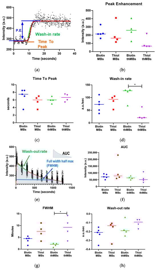 In vivo imaging showing subtle differences in imaging parameters between biotin–avidin and maleimide–thiol MBs and thMBs. (a) Parameters of the time intensity curve, generated by MB injection, were examined for differences in peak enhancement (P.E.) (b), time to peak (c) and the wash-in rate (d) between biotinylated or thiolated targeted MBs or thMBs. (e) The lifetime of the MB architectures was also examined in terms of the area under the curve (AUC) (f), the length of time that the contrast-enhanced signal intensity was detected at half the maximum signal or above (FWHM—(g)), and the wash-out rate (h). Individual data points represent a single mouse, the median is denoted, * p < 0.05, Mann–Whitney, two-tailed.