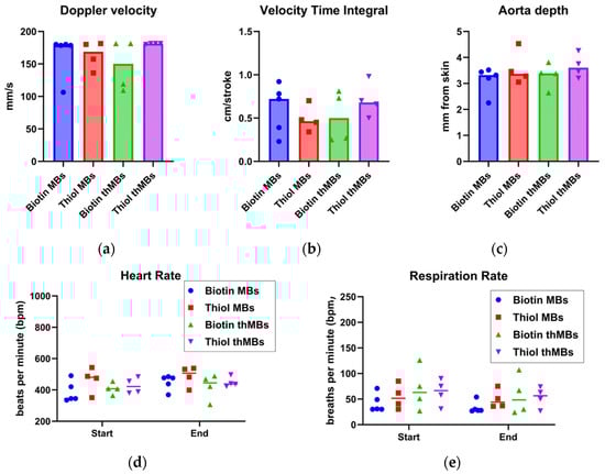 In vivo imaging differences in biotinylated and thiolated MB architectures are not due to differences in physiology between animals. (a) Doppler velocities (mm/s) were measured per animal using pulsed wave Doppler signal in the aorta alongside velocity time integral (cm/stroke, b), depth of the aorta (mm, c), mean heart rate at the beginning and end of the imaging process (beats per minute, bpm, d) and the same for the respiration rate (bpm, e). The results are shown for individual mice per MB type. ANOVA followed by Sidak’s multiple comparisons showed no statistically significant differences between the MB types for any of the physiological parameters measured.