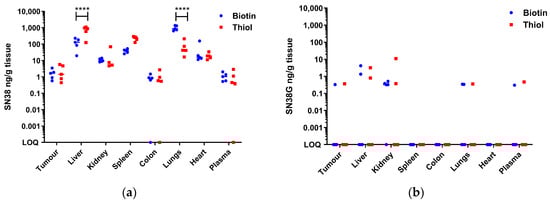 In vivo drug delivery of the two MB architectures showing differences in biodistribution. LC-MS/MS quantitation of tumour and organs from mice injected with thMBs that contained either biotin–avidin or maleimide–thiol linkages. The concentration of the encapsulated drug, SN38 (a), and its glucuronidated metabolite, SN38G (b), was determined in each tissue. n = 5 mice per group with the median denoted. Two-way ANOVA followed by Sidak’s multiple comparisons is shown **** p < 0.0001. LOQ means the sample was below the limit of quantitation (10 pg/mL for both SN38 and SN38G).