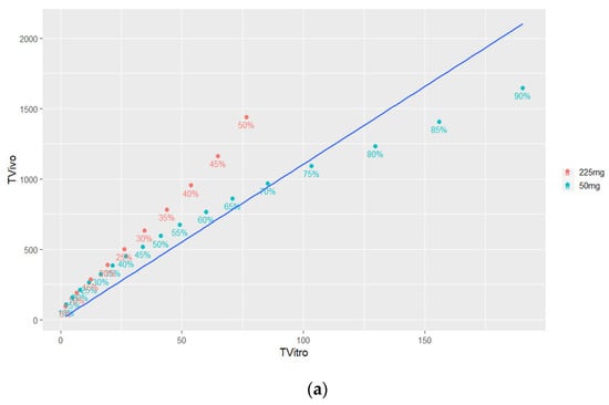 The in vitro release profiles were generated using an accelerated assay, leading to a faster TV-46000 degradation than observed in vivo based on the deconvoluted in vivo absorption profiles. Therefore, the obtained in vitro release profiles needed to be scaled in time prior to the correlation step with the deconvoluted profiles. This task was performed by linear interpolation using the Phoenix IVIVC Toolkit. The resulting Levy plot is shown in Figure 6a. The linear regression line shown in Figure 6a showed that the fit was not optimal (R2 = 0.91) due to large differences between dose strengths. A dedicated time scaling factor would be required for each strength to better fit the data. However, this is not a common practice and due to limited data available at this stage, decision was made to proceed with the presented time scaling. The equation resulting from the linear regression is shown in Equation (3) and was used to scale in vitro time points prior to the correlation step.