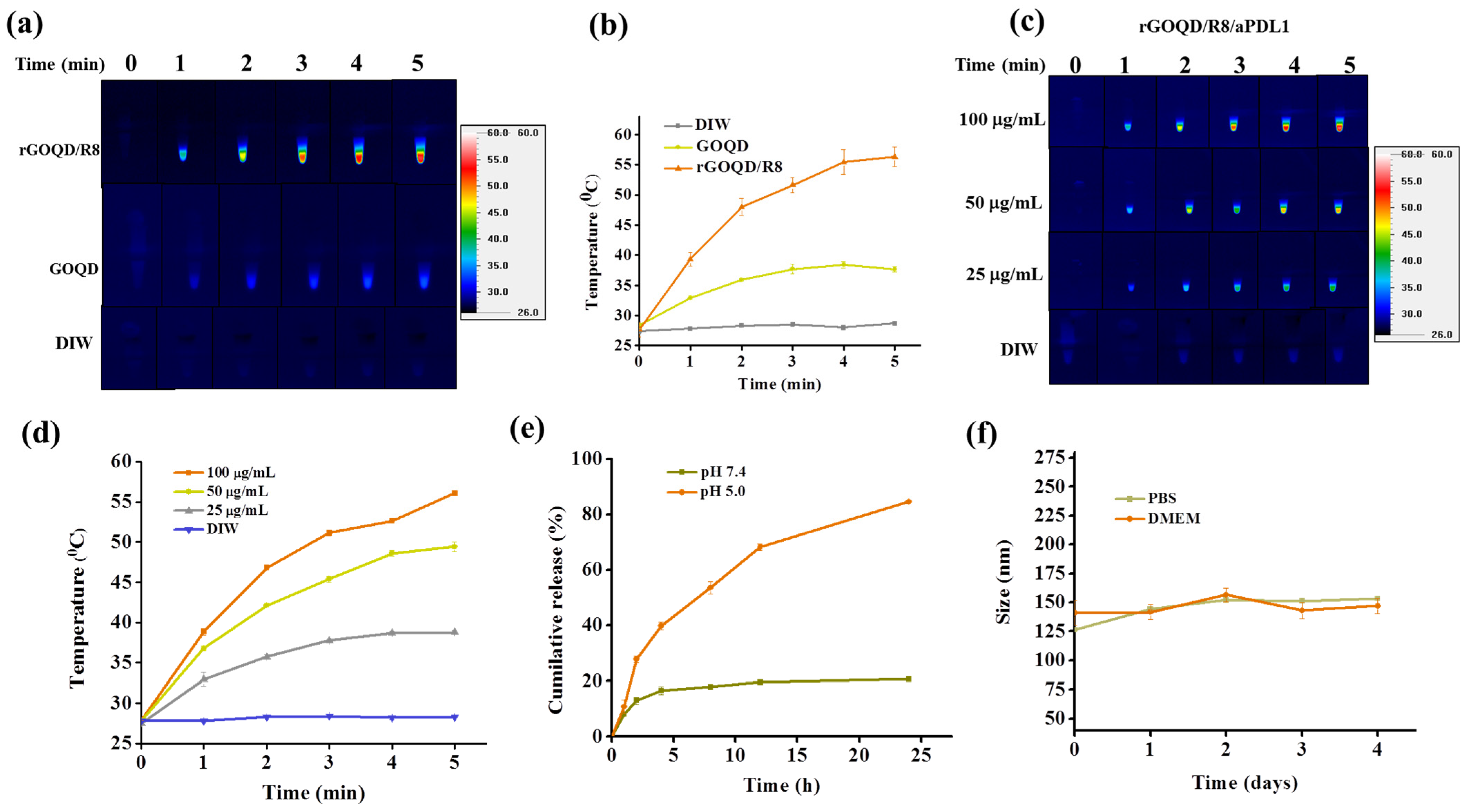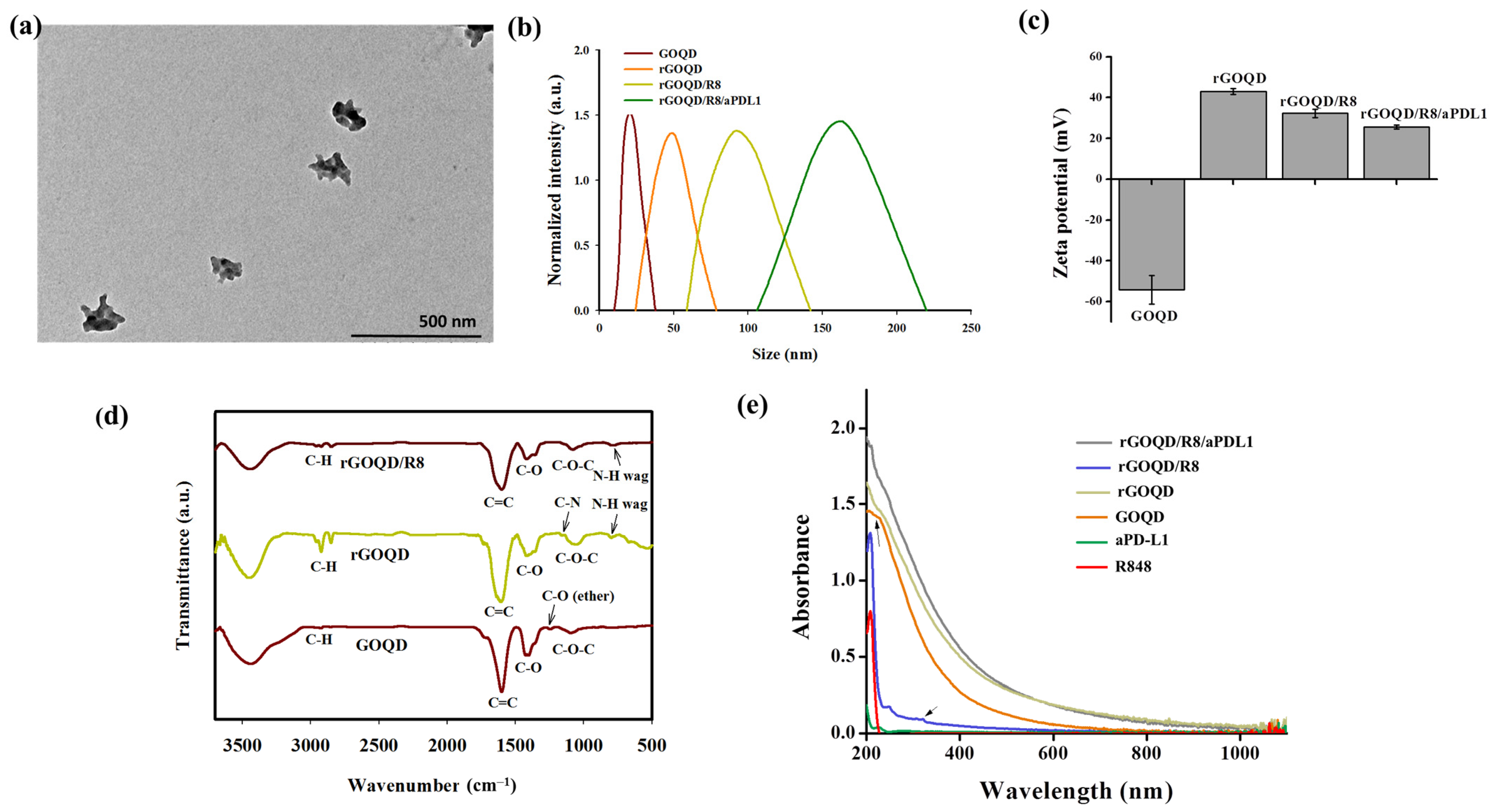 | rGOQD/R8/aPDL1 | 150 ± 7 | 0.22 ± 0.08 | 25.6 ± 1.0 |