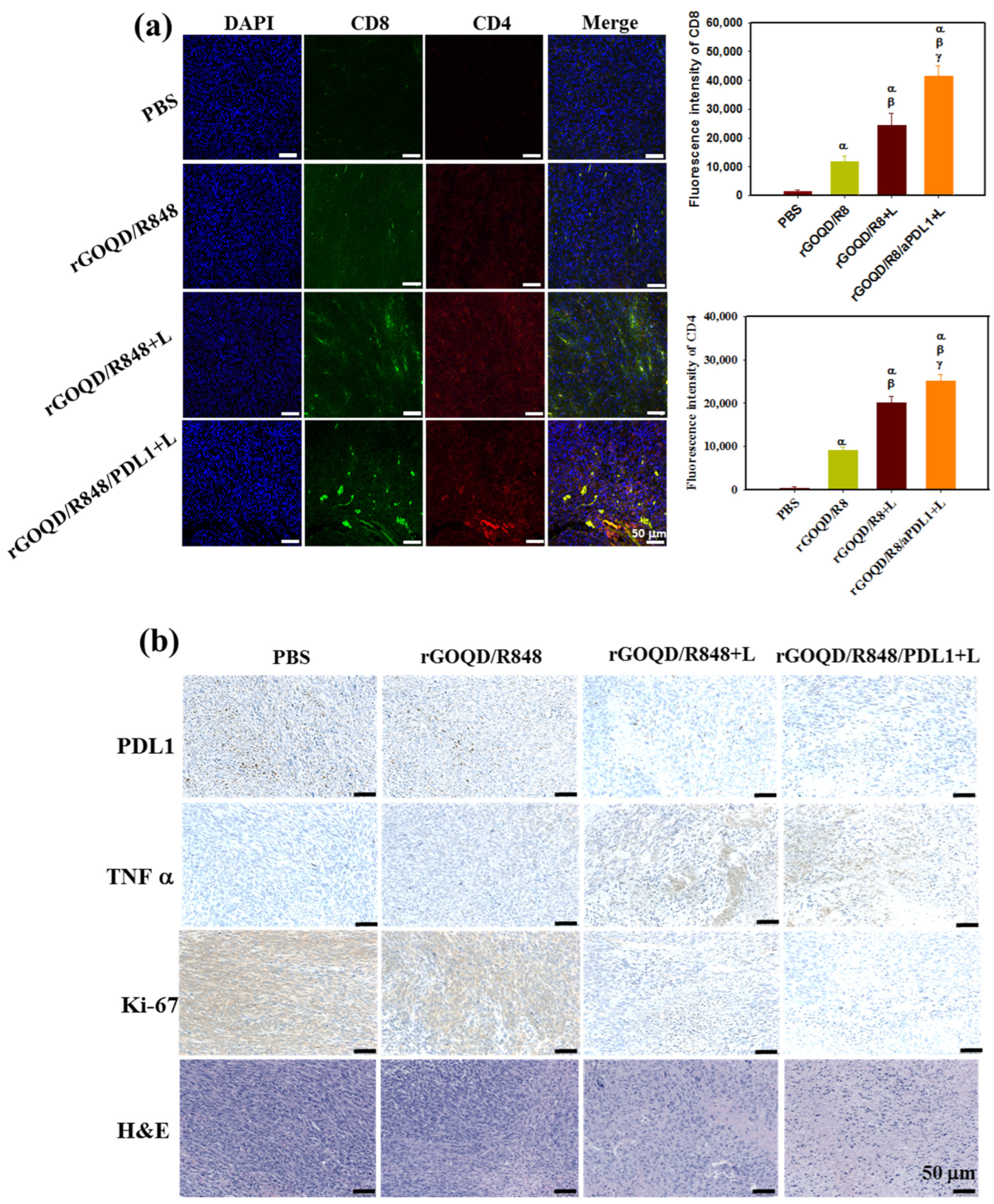 - Yan, M.; Liu, Y.; Zhu, X.; Wang, X.; Liu, L.; Sun, H.; Wang, C.; Kong, D.; Ma, G. Nanoscale Reduced Graphene Oxide-Mediated Photothermal Therapy Together with IDO Inhibition and PD-L1 Blockade Synergistically Promote Antitumor Immunity. ACS Appl. Mater. Interfaces 2019, 11, 1876–1885. [Google Scholar] [CrossRef] [PubMed]