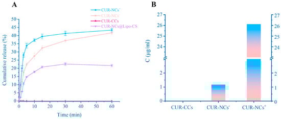Figure 5A shows the cumulative release curves of CUR-NCs+, CUR-NCs−, CUR-NCs@Lipo-CS, and CUR-CCs. It can be seen that CUR-CCs is insoluble in water and cannot be measured in water. Regardless of whether it is cationic or anionic, NCs can detect a large amount of CUR in the solution, but since the size of NCs+ is smaller than that of NCs−, according to the Noyes–Whitney equation: