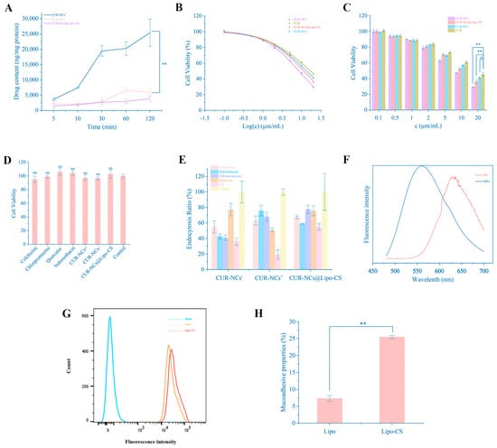 Chlorpromazine serves as an inhibitor of clathrin-mediated endocytosis, while indomethacin inhibits caveolae-mediated endocytosis. Colchicine acts as an inhibitor of macropinocytosis, and quercetin inhibits clathrin/caveolae-independent endocytosis [41]. A temperature of 4 °C primarily slows down cellular energy metabolism, thus impeding active transport. As depicted in Figure 7, the uptake of CUR-NCs@Lipo-CS, CUR-NCs+, and CUR-NCs− is an energy-intensive process. Moreover, the data (Figure 7E) indicate that various inhibitors exert inhibitory effects on cellular uptake, suggesting the involvement of multiple uptake pathways. Non-grid- and non-nubbin-mediated endocytosis is the primary internalization mechanism for CUR-NCs+, whereas nubbin-mediated endocytosis is the likely route for CUR-NCs@Lipo-CS. Cell viability experiments revealed that the addition of inhibitors, including CUR-NCs@Lipo-CS, CUR-NCs+, and CUR-NCs−, did not significantly impact cell viability throughout the experiments.