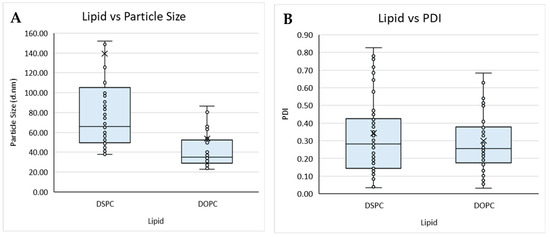 It was also shown that the production temperature and resultant size of the liposomes may be dependent on the solvent used. Transcutol and ethanol were compared at four different temperatures, and it was shown that with the increasing temperature, the size of the liposomes produced from ethanol decreased, whereas the liposomes produced from Transcutol showed no effect. In the present study, it was shown that temperature alone had no overall effect on the resultant liposome physicochemical characteristics; however, further analysis showed that temperature can interact with the lipid concentration and lipid and solvent used to determine both the size and PDI.