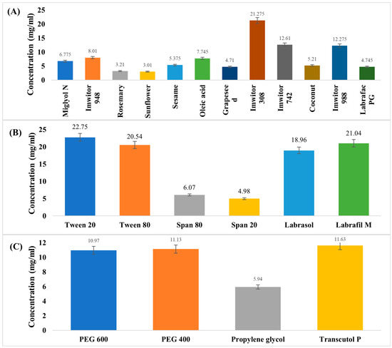The saturated solubility of ACM in (A) different oils, (B) different surfactants, and (C) different co-surfactants.