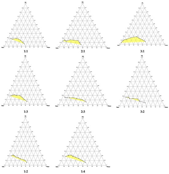 The pseudo-ternary phase diagrams for oil (Imwitor 308), Smix (Tween: Transcutol-P) at different ratios (1:1, 2:1, 3:1, 1:3, 2:3, 3:2,1:2 and 1:4), and water. The yellow-highlighted region represents the one-phase region, whereas the uncolored area corresponds to the two-phase microemulsion region.