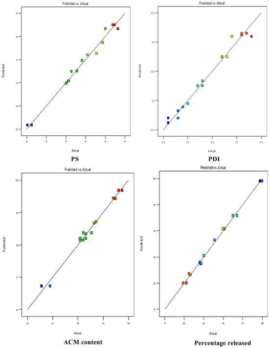 Predicted vs. actual for PS (globule size), PDI (polydispersity index), ACM content, and percentage of drug released. Blue indicates lower values, green indicates moderate values, and yellow/orange to red indicates higher values.