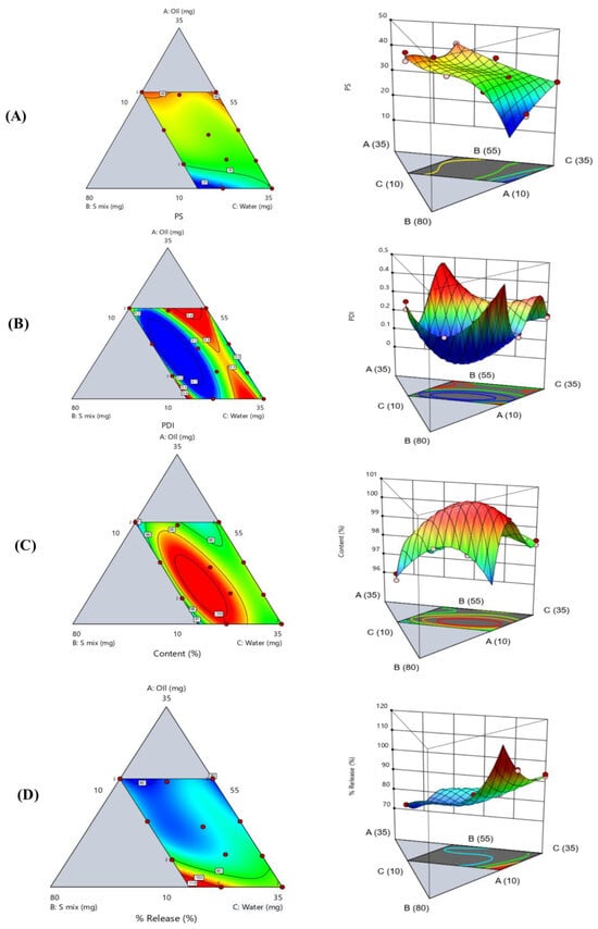 The contour and 3D surface plots for (A) (globule size), (B) (polydispersity index), (C) (ACM content), and (D) (percentage of drug released). Blue indicates lower values, green moderate values, and red/yellow higher values.